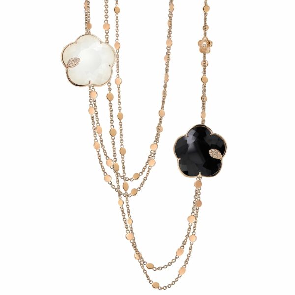 Necklace in 18 kt rose gold with White Agate and Mother of Pearl Doublet , Onyx,White and Champagne Diamonds.