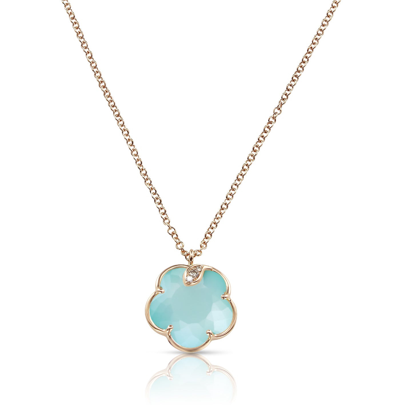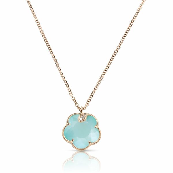 Necklace Petit Joli in 18 kt rose gold with Sea Moon Gem made of Turquoise and White Moonstone Doublet , white and champagne diamonds